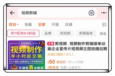 淘宝可是一个深不可测的剪辑接单巨无霸。你直接搜索“视频剪辑”、“宣传片制作”等,会冒出很多提供服务的设计店铺。